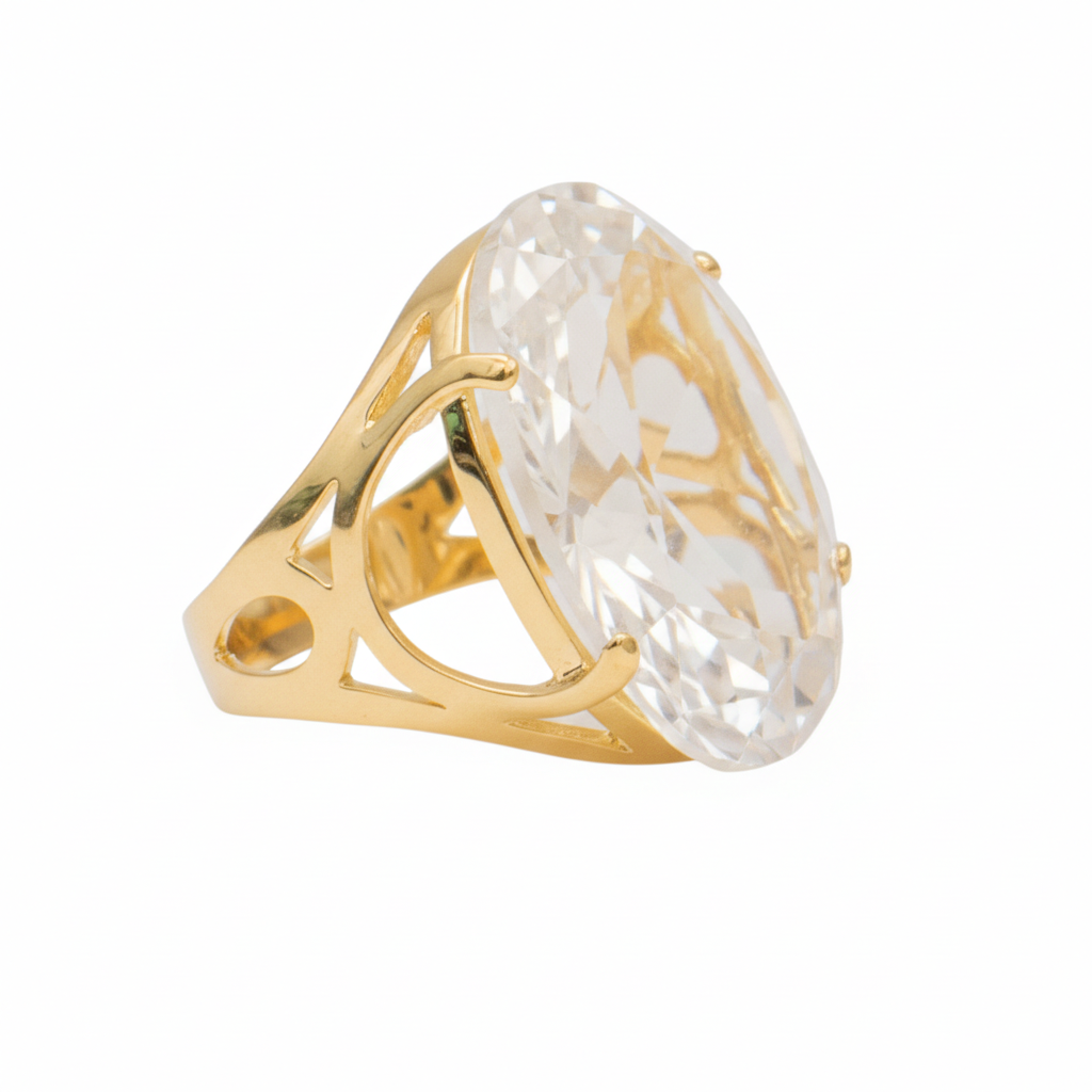 Anel Pedra Oval Grande Cristal Branco Banhado a Ouro 18k