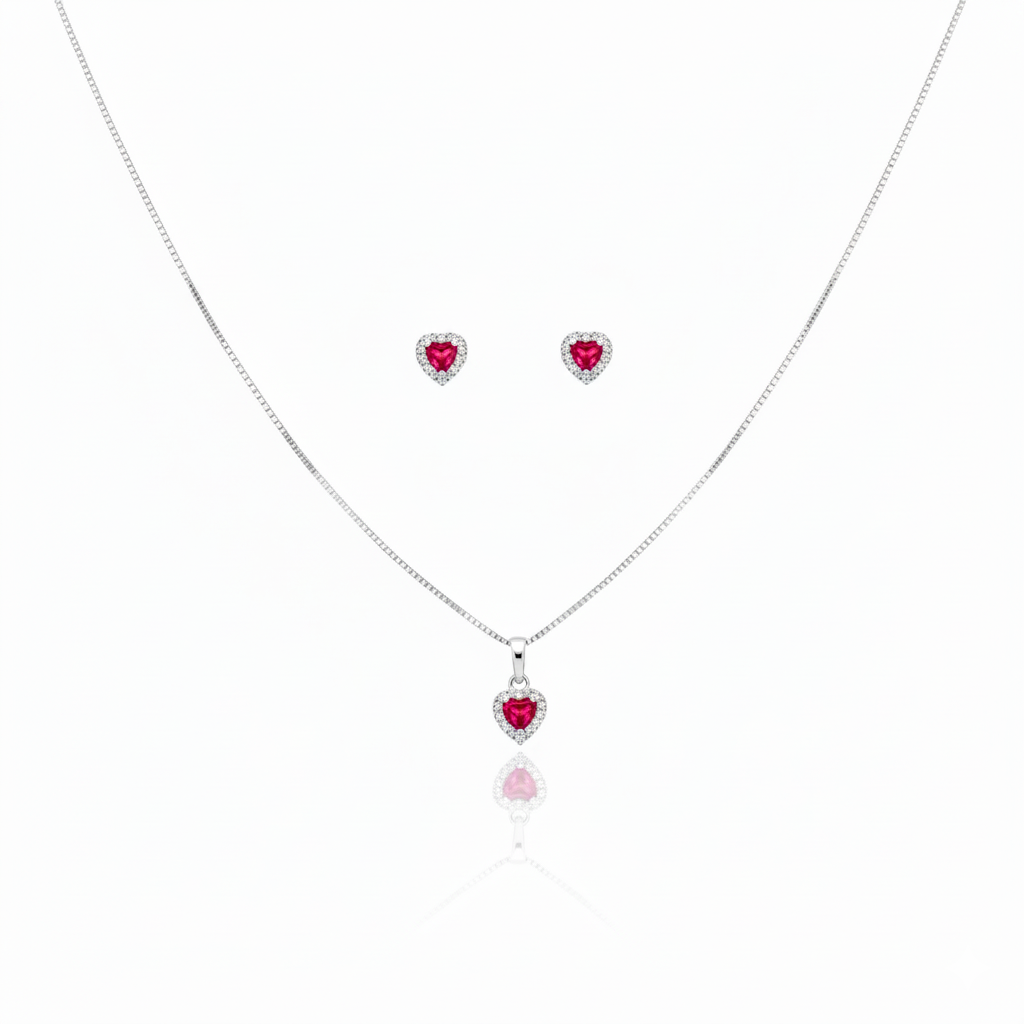 Conjunto Colar e Brinco Coração Rosa Cristal Prata Fina 925 - Jóia em Prata