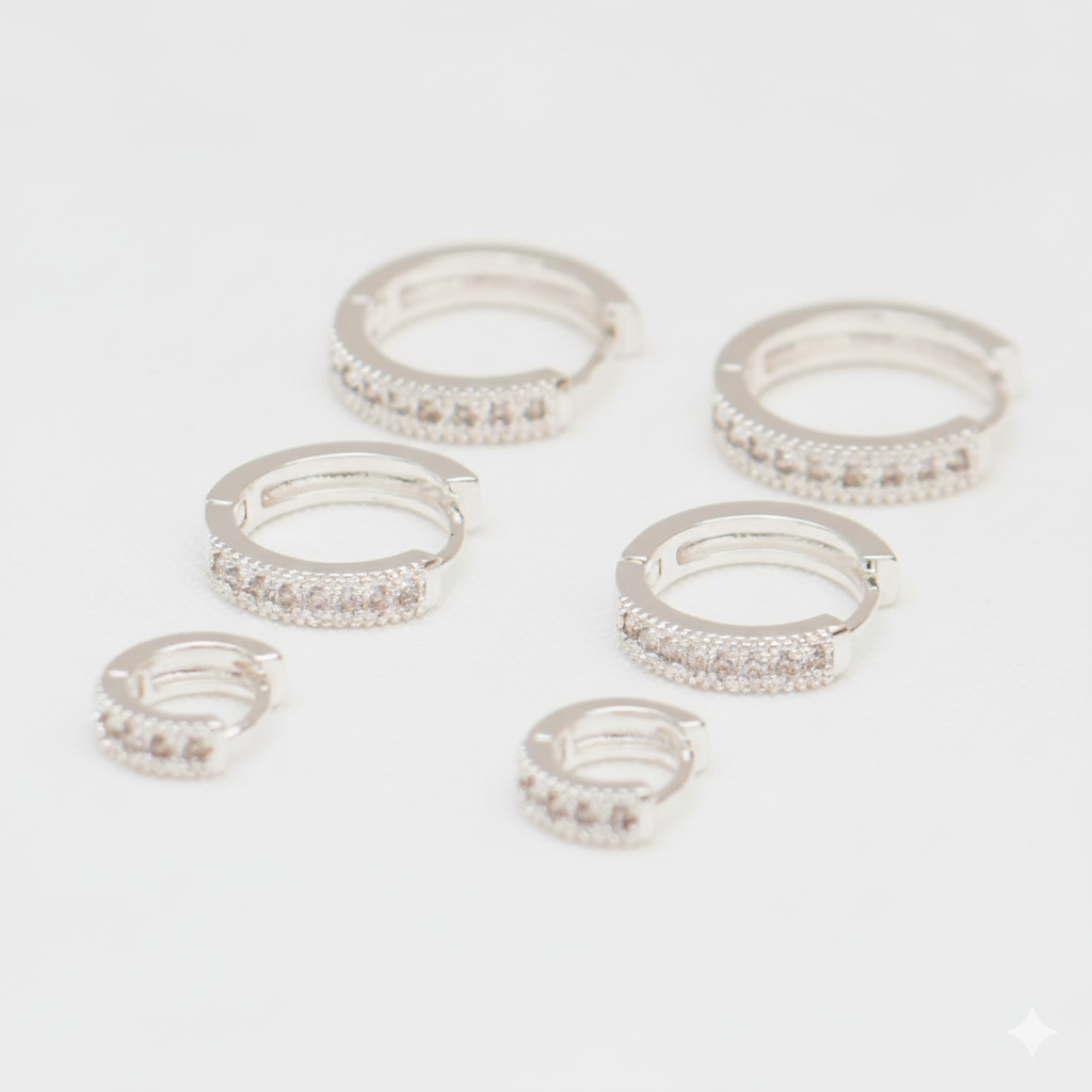 Este trio de argolas cravejadas com zircônias é perfeito para quem ama brilho na medida certa. Cada par possui 5 mm de espessura e tamanhos diferentes para um visual harmônico: